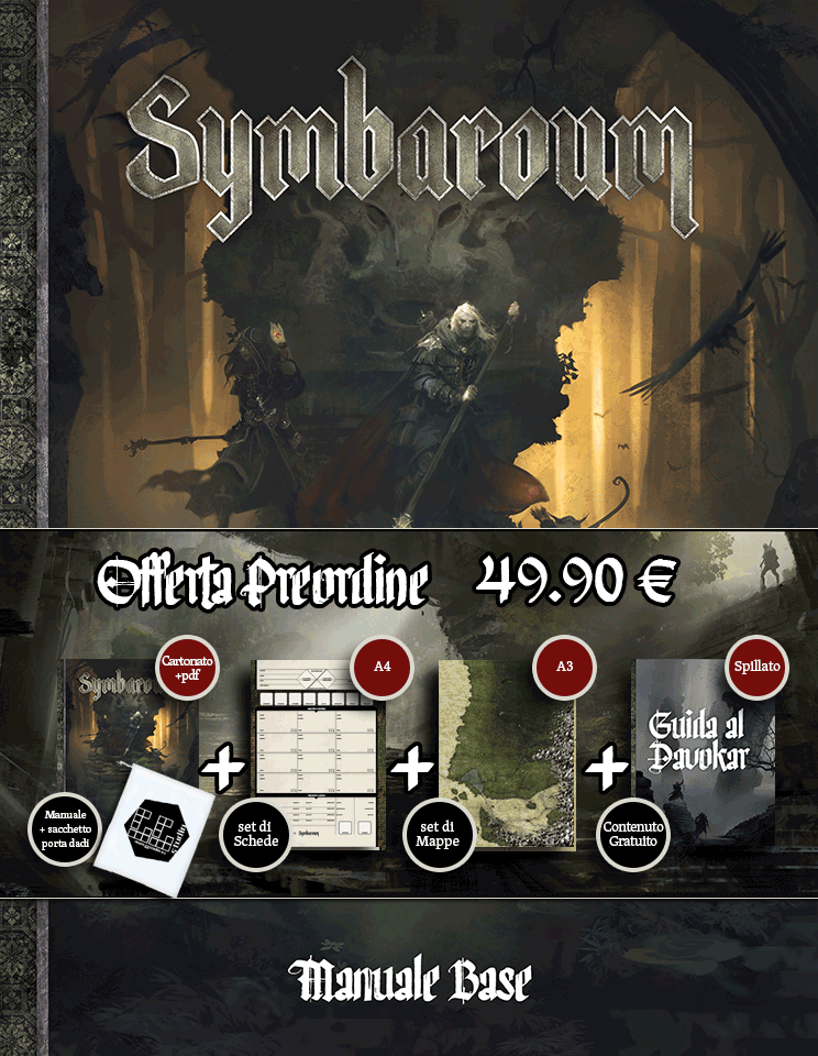 Dopo il successo ottenuto all’estero, arriva in Italia il gioco di ruolo definito come la perfetta fusione tra Il Trono di Spade e La Principessa Mononoke. Un modo duro e spietato, nato dalle ceneri di un passato turbolento e dalla caduta delle gerarchie sociali che non nega a nessuno l’opportunità di emanciparsi da una vita votata alla sola sopravvivenza, a patto di avere il coraggio di affrontare le insidie nascoste e le seduzioni mortali del Davokar, l’oscura foresta che racchiude nelle sue profondità i resti dell’antico impero di Symbaroum, origine del male e sorgente di riscatto. Sei pronto a sfidare il Patto di Ferro, il contagio del Morbo, la furia dei troll e l’astuzia del Popolo Antico per riempire la tua borsa, ampliare la tua conoscenza o glorificare la tua casata? Symbaroum ti accompagnerà sulla strada dell’avventura facendoti vivere emozioni indimenticabili!